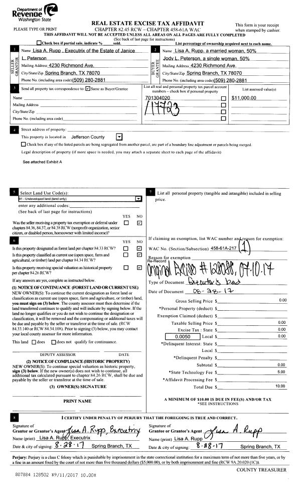 | Mailing Address: | JEANIE L ORR 41 VANCOUVER PL PORT TOWNSEND, WA 98368-9445 | % Ownership: | 100.0000000000% |