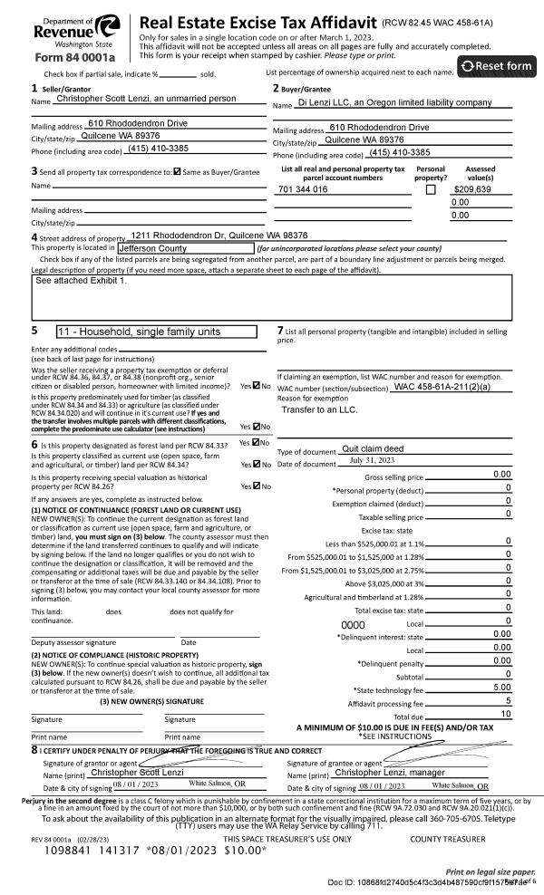 | Mailing Address: | 12 QUEETS PL PORT TOWNSEND, WA 98368-9430 | % Ownership: | 100.0000000000% |