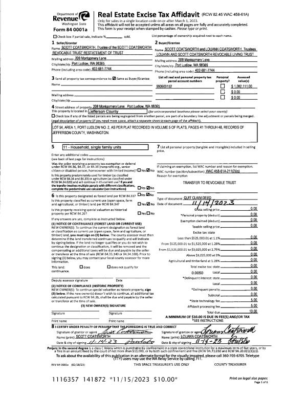 | Mailing Address: | 101 HEMLOCK DR PORT TOWNSEND, WA 98368-9439 | % Ownership: | 100.0000000000% |
