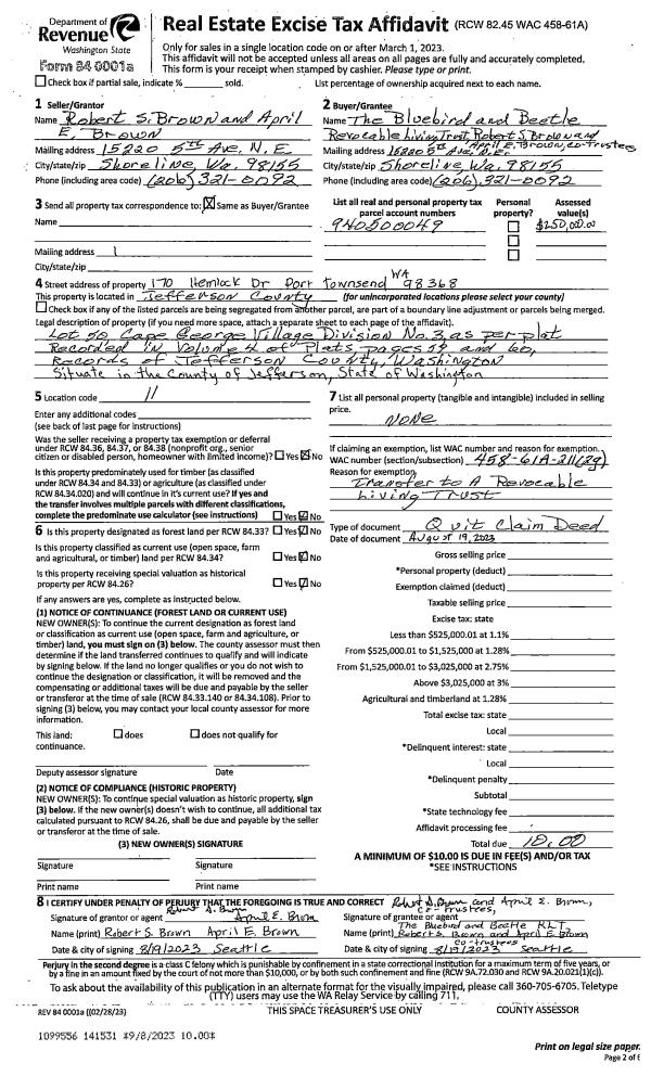 | Mailing Address: | 430 RIDGE DR PORT TOWNSEND, WA 98368-9495 | % Ownership: | 100.0000000000% |