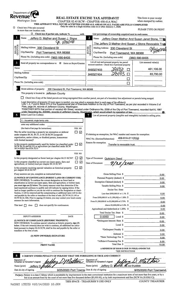 | 6 | 03/10/1994 | QCD | Quit Claim Deed | COFFEE, RICHARD W/HENKE E | COFFEE FAMILY TRUST | 0 | 0 | $0.00 | 74053 | 0 |