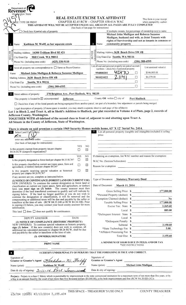 | 2 | 07/28/2015 | SWD | Statutory Warranty Deed | ROSALYN FETTIG & WILLIAM BEEZLEY | ROBERT L REEVES REVOCABLE TRUST | | | $280,000.00 | 123698 | |