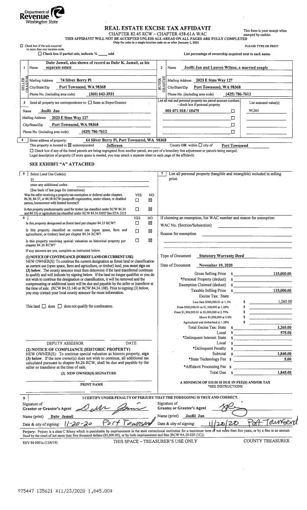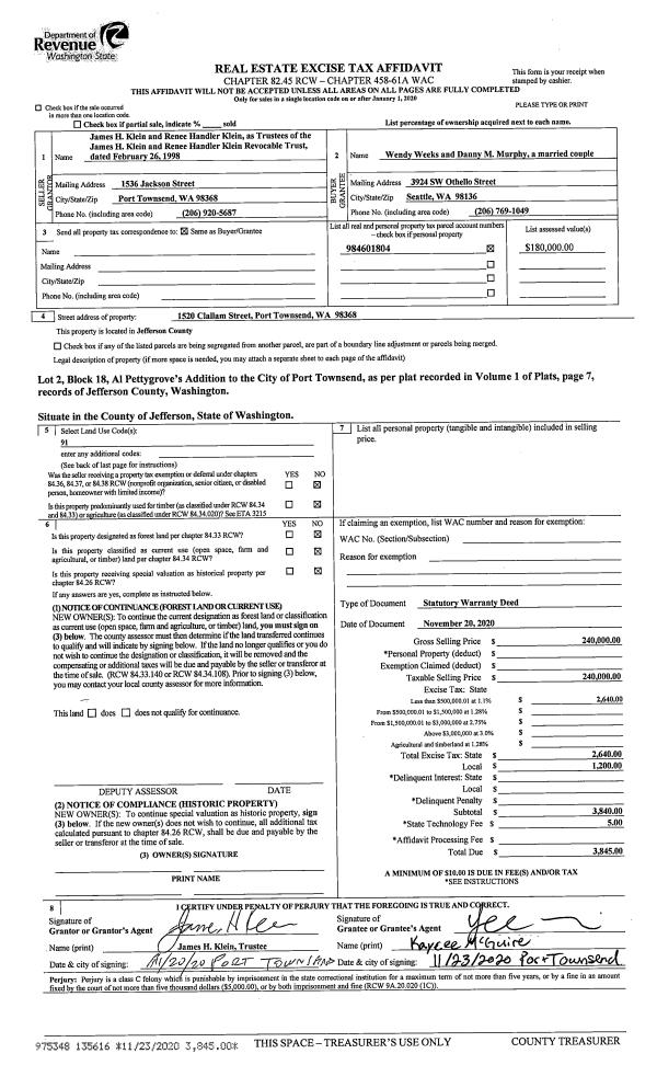| 1 | 04/01/2021 | SWD | Statutory Warranty Deed | ALICE R THOMAS JOHNSON | THEODORE & DONNA J KITCHNER | | | $100,000.00 | 136446 | |