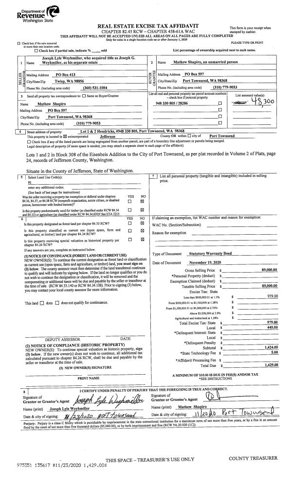 | 1 | 04/01/2021 | SWD | Statutory Warranty Deed | ALICE R THOMAS JOHNSON | THEODORE & DONNA J KITCHNER | | | $100,000.00 | 136446 | |