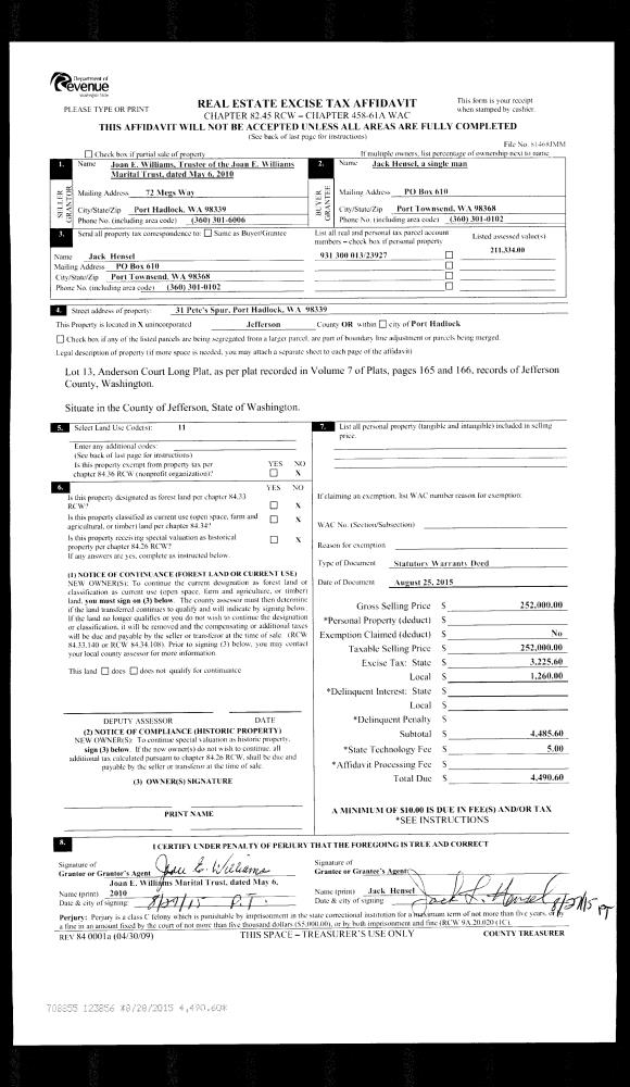 | 2 | 1210-1175L | Lots in Carroll's Hood Canal View Estates | 0.0000 | 0.00 | 0.00 | 0.00 | 2.00 | $36,300 | $0 |