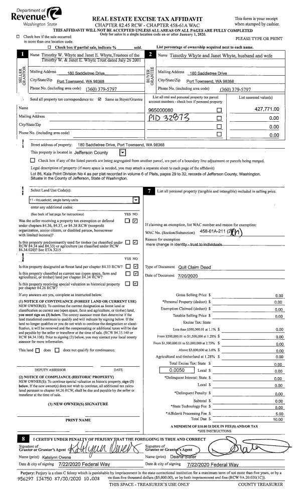 | 1 | 04/05/2020 | QCD | Quit Claim Deed | W F BECK INC A WA CORP | FAY C BECK | | | | 134220 | |