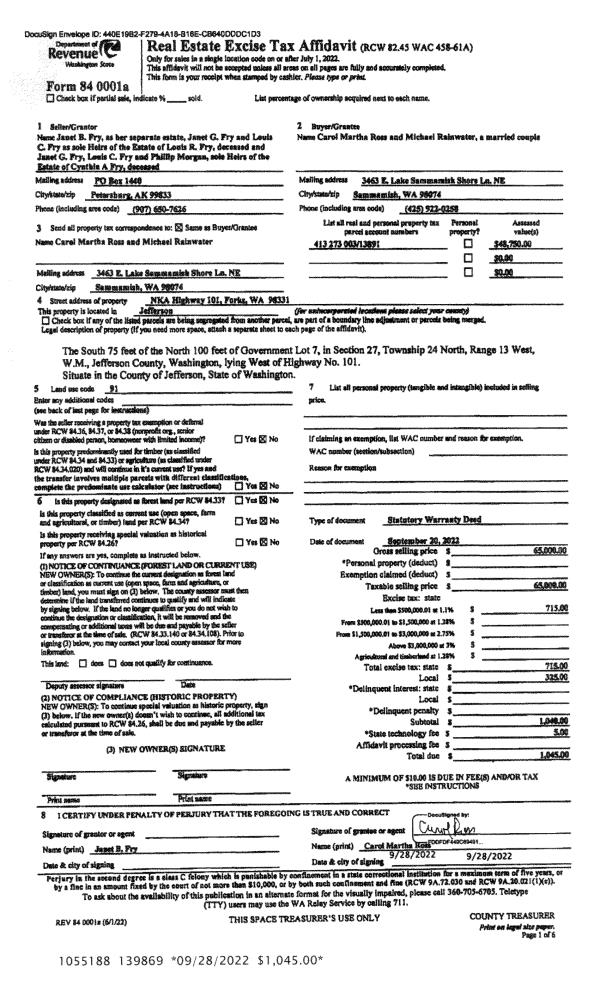 | 1 | 01/10/2019 | REC | Real Estate Contract | WILLIAM S MARLOW | CHIMACUM PROPERTIES LLC | | | $115,000.00 | 131830 | |