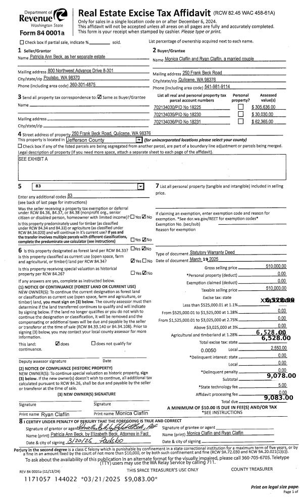 | 3 | 08/15/2011 | WD | Warranty Deed | PLATT, IRWIN LAW FIRM, TR | FIRST FEDERAL S & L, PORT ANGE | 0 | 0 | $0.00 | 116399 | 0 |