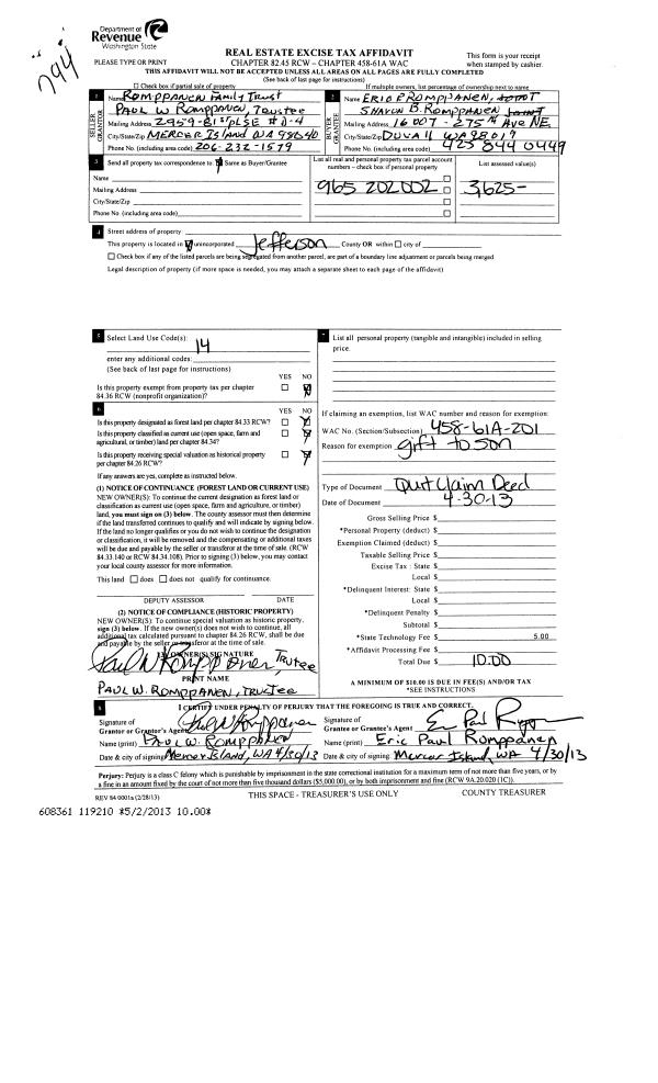 | 1 | 06/20/2013 | QCD | Quit Claim Deed | ARTHUR E HUFFMAN | HUFFMAN FAMILY TRUST | | | | 119540 | |