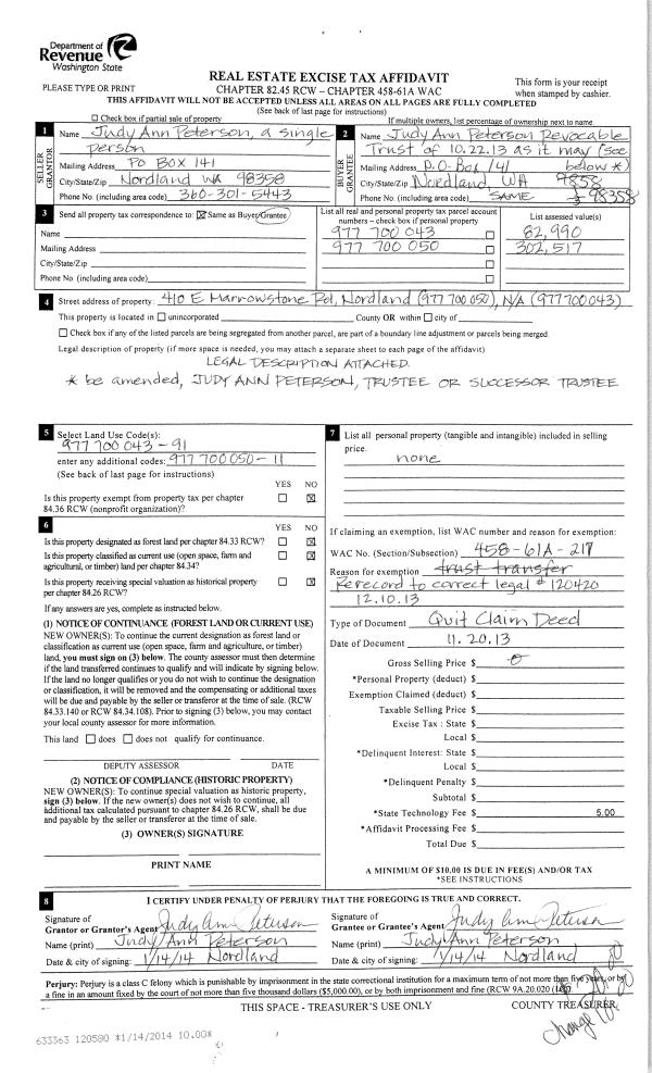 | 1 | 12/02/2014 | QCD | Quit Claim Deed | VALERIE MILLICAN | VALERIE A MILLICAN LIVING TRUST | | | | 122324 | |