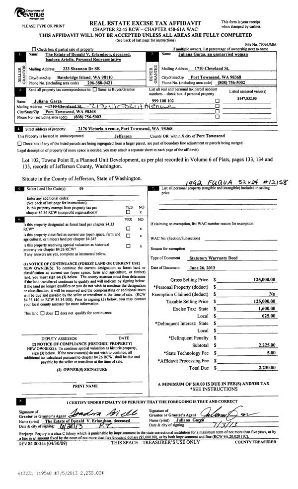 | 2 | 07/29/2014 | SWD | Statutory Warranty Deed | CHRISTEL A BLEDSOE | JULIA & ROBERT KILCULLEN | | | $140,000.00 | 121633 | |