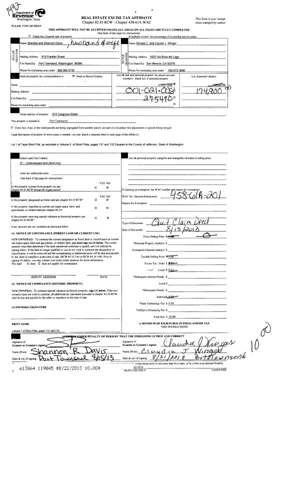 | Mailing Address: | 305 FREDERICKS ST PORT TOWNSEND, WA 98368-9757 | % Ownership: | 100.0000000000% |