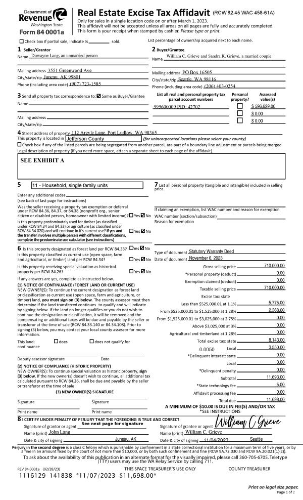 | Mailing Address: | 120 BAYVIEW LN PORT TOWNSEND, WA 98368-9284 | % Ownership: | 100.0000000000% |