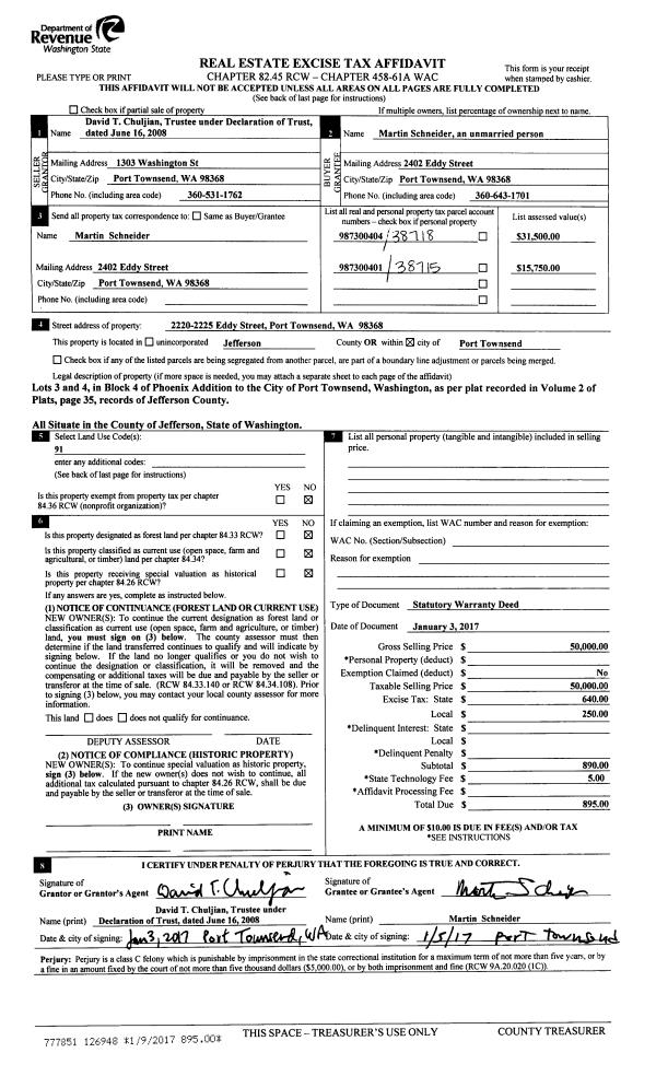 | 1 | 07/24/2017 | SWD | Statutory Warranty Deed | CHRISTOPHER J EVANS TRSTEE | ADRIENNE ELY | | | $45,000.00 | 128548 | |