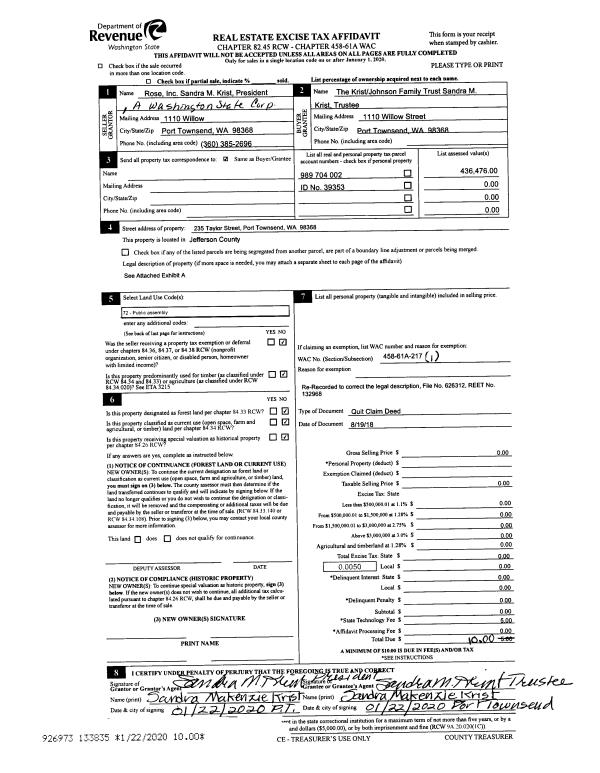 | Mailing Address: | MOLLY G FLETCHER 82 S DUQUESNE AVE PORT TOWNSEND, WA 98368-2804 | % Ownership: | 100.0000000000% |