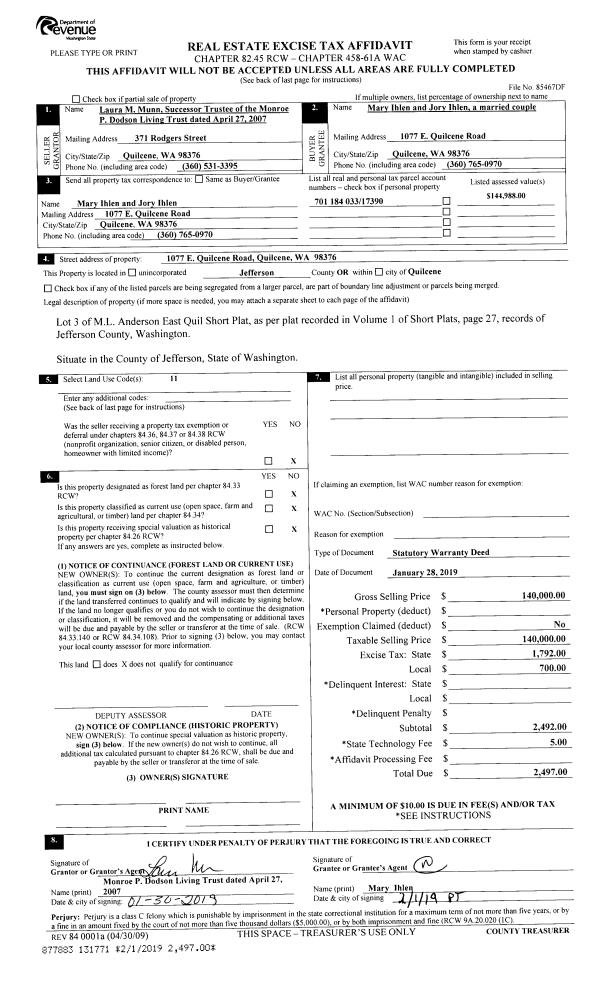 | 6 | 02/05/1990 | SWD | Statutory Warranty Deed | PEARIA, JOHN R/VIRGINIA I | PURDY, VIRGINIA C, ET AL | 0 | 0 | $0.00 | 67601 | 0 |