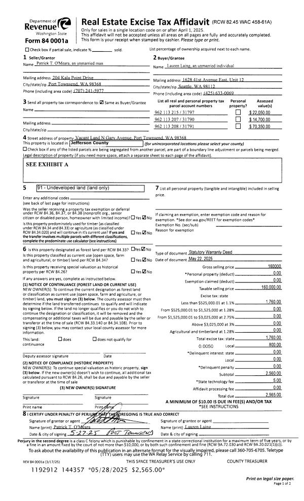 | Mailing Address: | LIANNE C PERRON-KOSSOW 929 22ND ST PORT TOWNSEND, WA 98368-7708 | % Ownership: | 100.0000000000% |