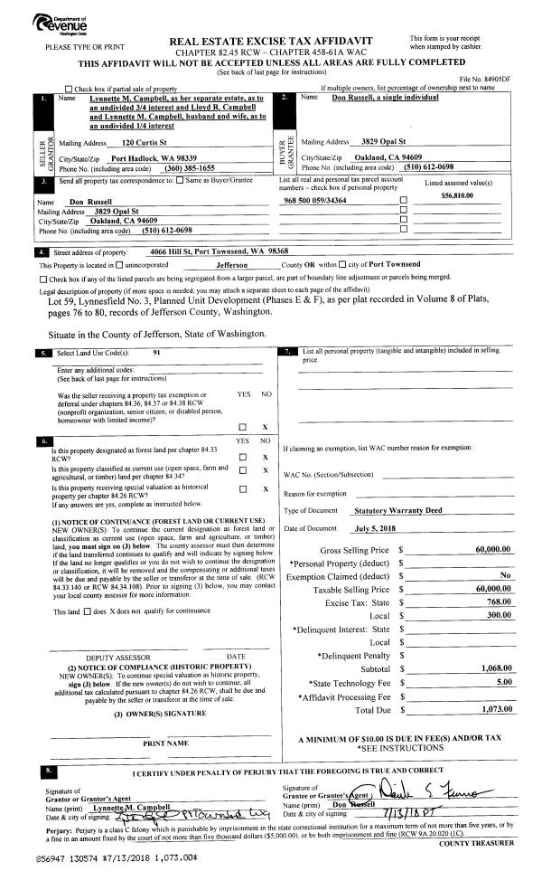 | Mailing Address: | 926 18TH ST PORT TOWNSEND, WA 98368-6005 | % Ownership: | 100.0000000000% |