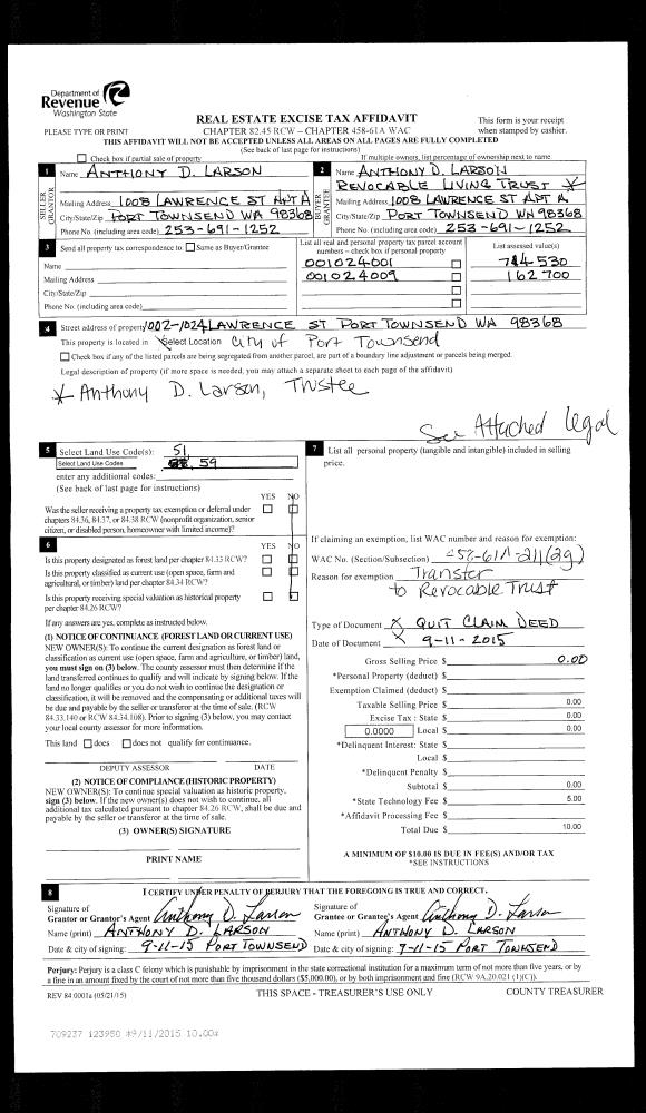 | Mailing Address: | 1030 10TH ST PORT TOWNSEND, WA 98368-2905 | % Ownership: | 100.0000000000% |