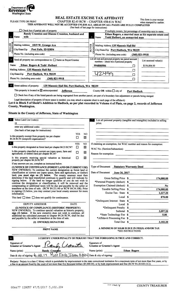 | 4 | 03/08/2017 | SWD | Statutory Warranty Deed | VERNON I GARRISON LIVING TRUST | MICHAEL DODEK | | | $120,000.00 | 127267 | |