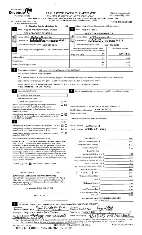 | 3 | 12/26/2019 | QCD | Quit Claim Deed | ALLEN LOGGING CO | ALLEN HOH RIVER PROPERTIES LLC | | | | 133723 | |