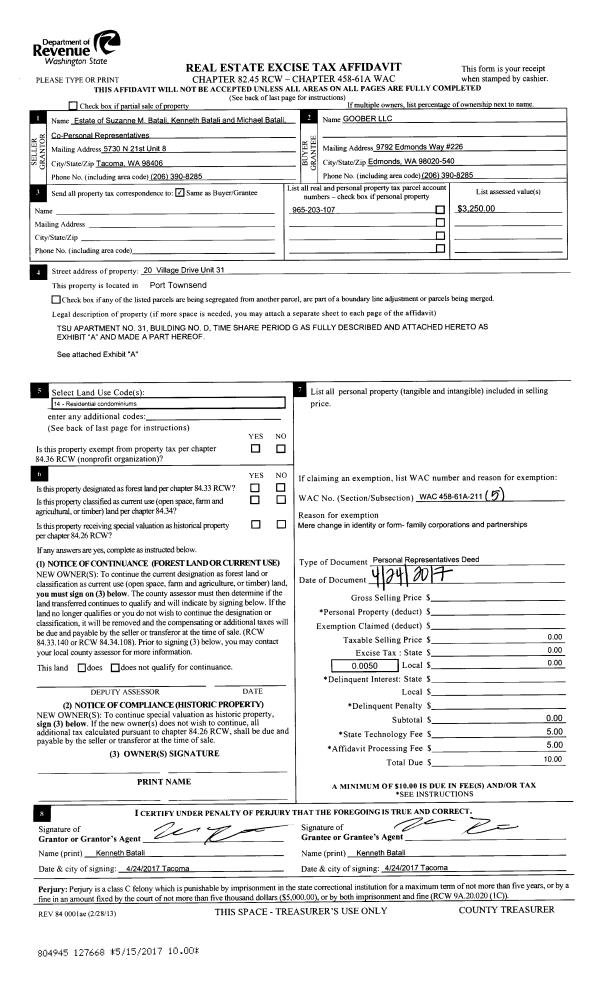 | 1 | 9883-4175S | Quimper Village Condos w/Utilities/Common | 0.0000 | 0.00 | 0.00 | 0.00 | 1.00 | $198,000 | $0 |