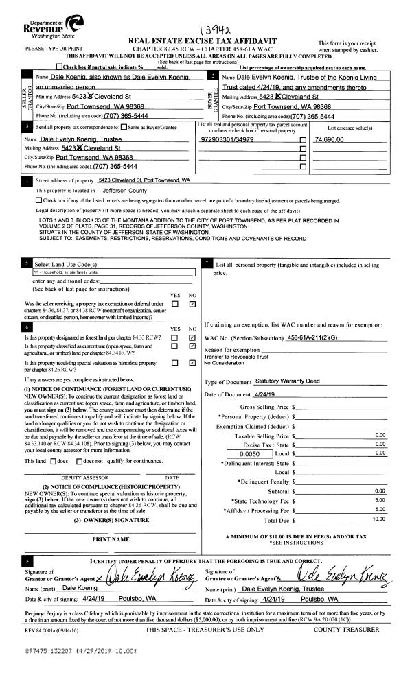 | 4 | 03/19/2019 | MISC | MISC | ERICA BAUERMEISTER AND BENJAMIN BAUERMEISTER | CITY OF PORT TOWNSEND | | | | 0 | 623112 |