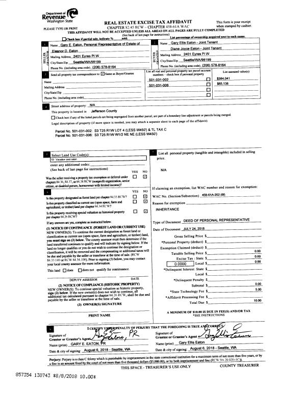 | 3 | 09/10/2003 | SWD | Statutory Warranty Deed | OLIVER, CATHERINE L | GREENE, GLADYS M/WALTER H | 0 | 0 | $100,000.00 | 98280 | 0 |