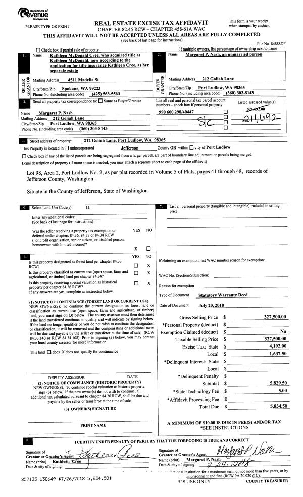 | 5 | 12/28/1993 | SWD | Statutory Warranty Deed | OLSEN, MICHAEL H/KIMBERLY | FAY, LAWRENCE D/JR | 0 | 0 | $71,000.00 | 73015 | 0 |