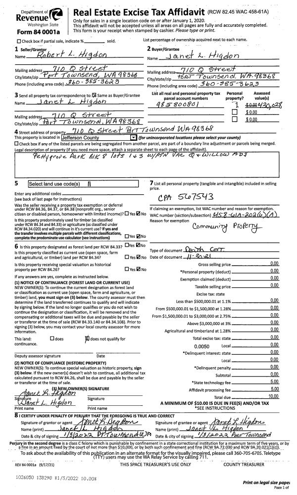 | Mailing Address: | 293522 US HIGHWAY 101 QUILCENE, WA 98376-9764 | % Ownership: | 100.0000000000% |