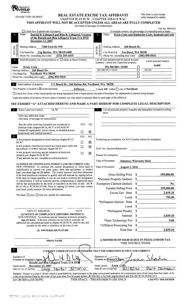 | 5 | 03/31/1994 | SWD | Statutory Warranty Deed | HARRISON, EDITH L | PEDERSON, WALTER H | 0 | 0 | $15,000.00 | 73711 | 0 |