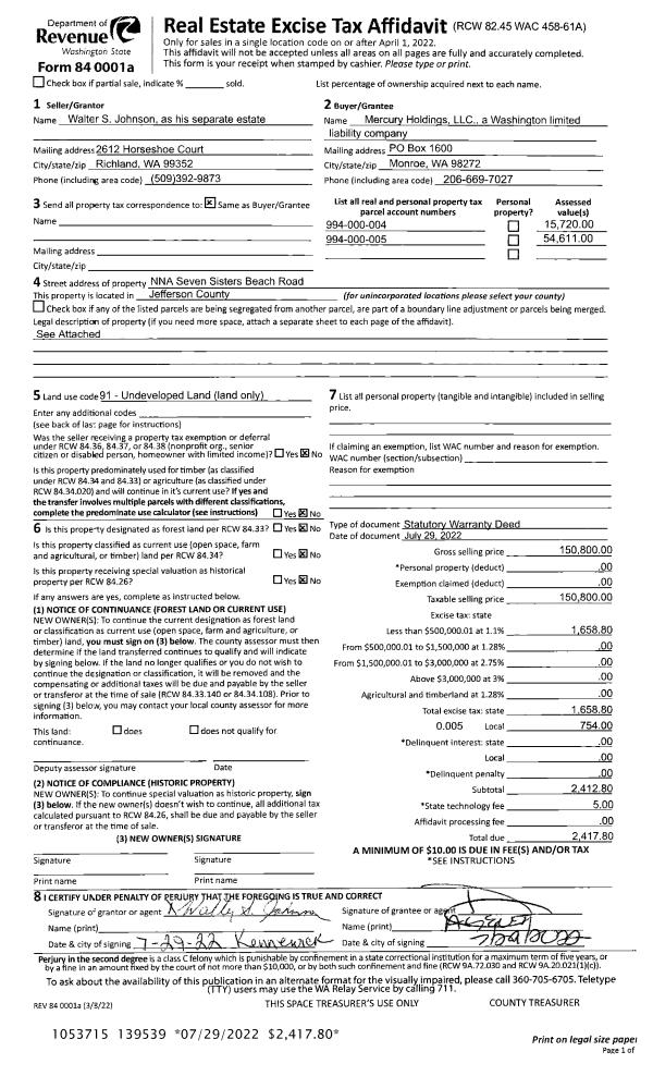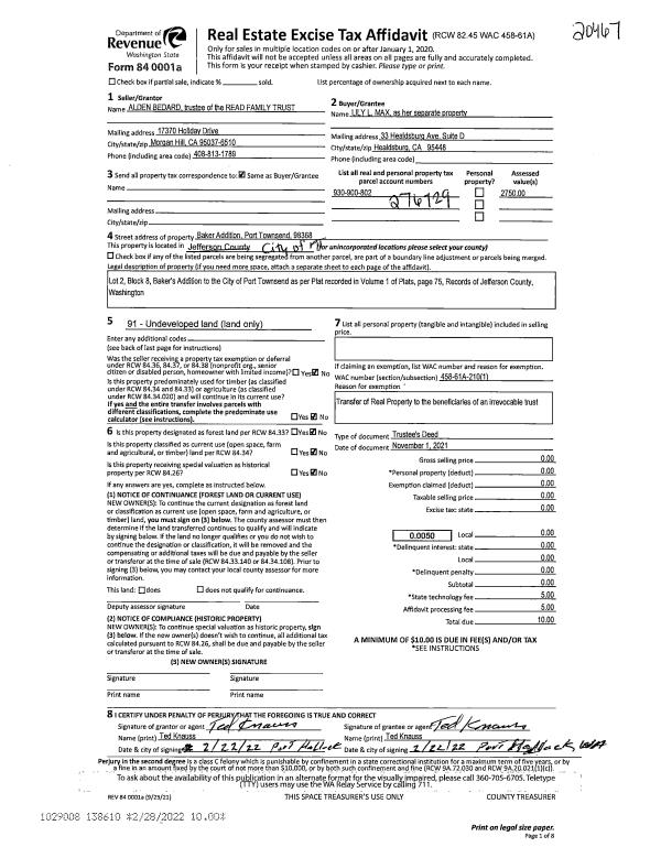 | 1 | 05/26/2022 | SWD | Statutory Warranty Deed | PEGGY PEDERSON TRUST | GENE CARTWRIGHT | | | $19,367.00 | 139401 | |