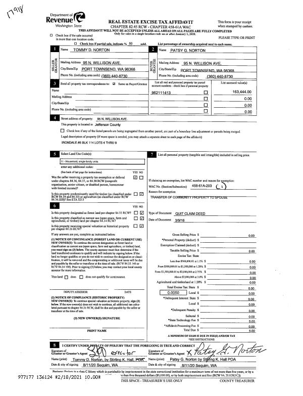 | 1 | 11/15/2021 | SWD | Statutory Warranty Deed | MARTIN D MEYER | GENE CARTWRIGHT | | | $2,600.00 | 138053 | |