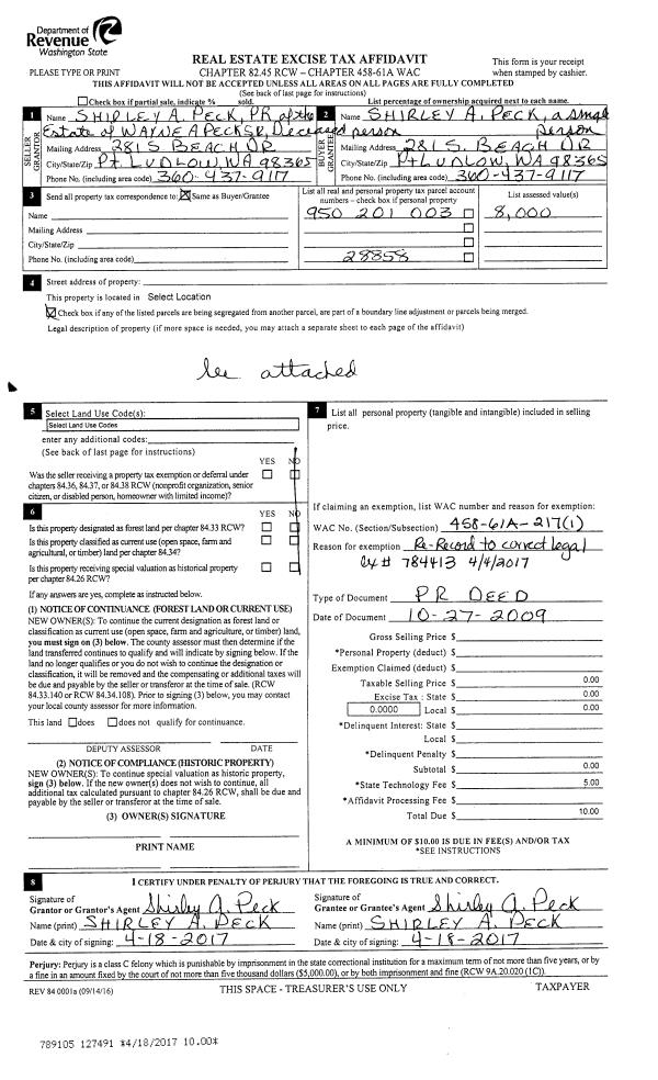 | 3 | 01/09/2018 | QCD | Quit Claim Deed | DANA & RENA BEHAR | OLYMPIC PENINSULA LAND LLC | | | | 129400 | |