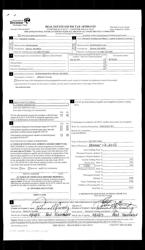 | Mailing Address: | 110 LELAND VALLEY RD W QUILCENE, WA 98376-5100 | % Ownership: | 100.0000000000% |