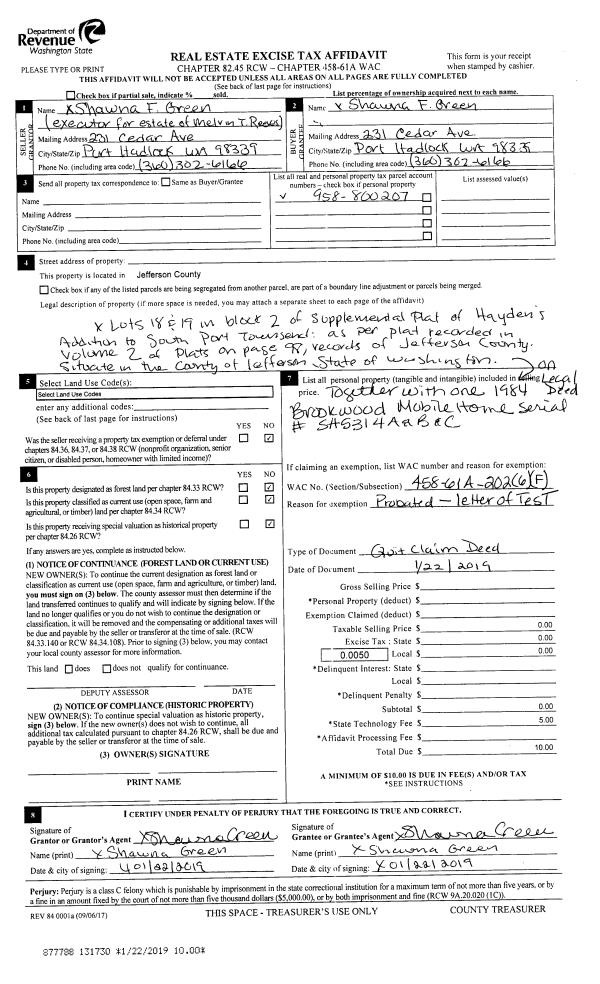 | 4 | 01/04/2001 | QCD | Quit Claim Deed | OLSEN, PEGGY J | LOECHEL, CHRISTINE A/WILLIAM H | 0 | 0 | $0.00 | 91414 | 0 |