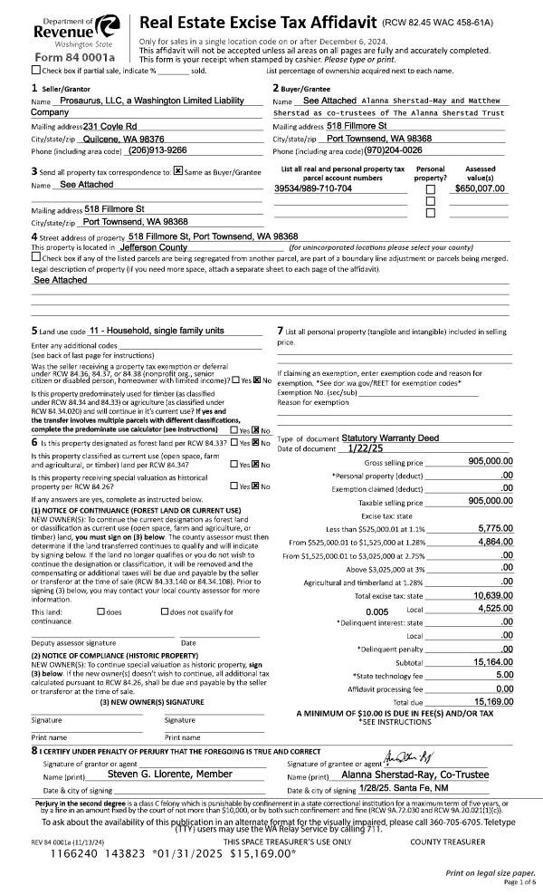 | Mailing Address: | HOLLY & TODD CARLSON TRUSTEES 939 TAYLOR ST PORT TOWNSEND, WA 98368-5432 | % Ownership: | 100.0000000000% |