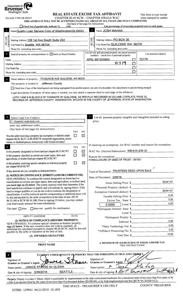 | Mailing Address: | 70 CARROLL AVE PORT TOWNSEND, WA 98368-9364 | % Ownership: | 100.0000000000% |