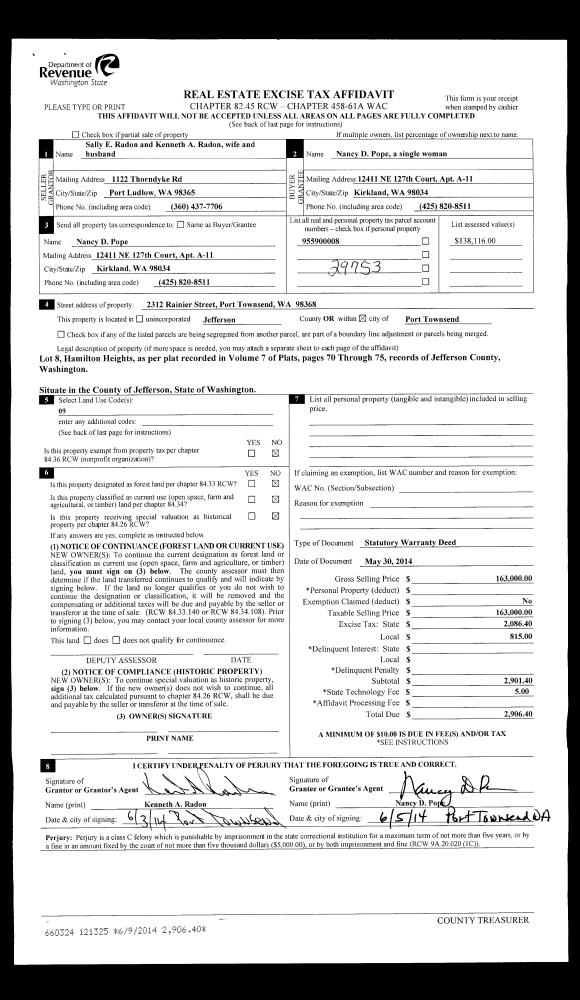 | 6 | 06/23/2005 | SWD | Statutory Warranty Deed | HAMILTON HEIGHTS LLC | KITSAP COUNTY CONSOLIDATED HOU | | | $280,077.00 | 103994 | 0 |