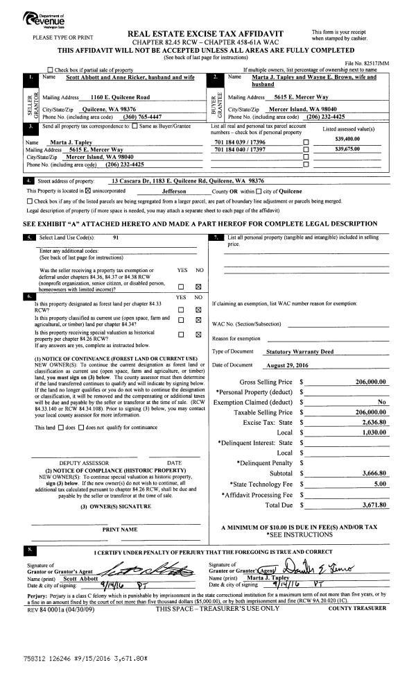 | 1 | 02/09/2017 | QCD | Quit Claim Deed | JONATHAN VANCE | VANCE LIVING TRUST | | | | 127127 | |