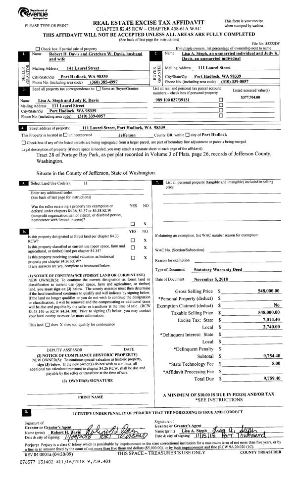 | Mailing Address: | 212 22ND ST PORT TOWNSEND, WA 98368-7836 | % Ownership: | 100.0000000000% |