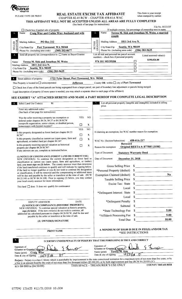 | Mailing Address: | 4948 MASON ST PORT TOWNSEND, WA 98368-1908 | % Ownership: | 100.0000000000% |