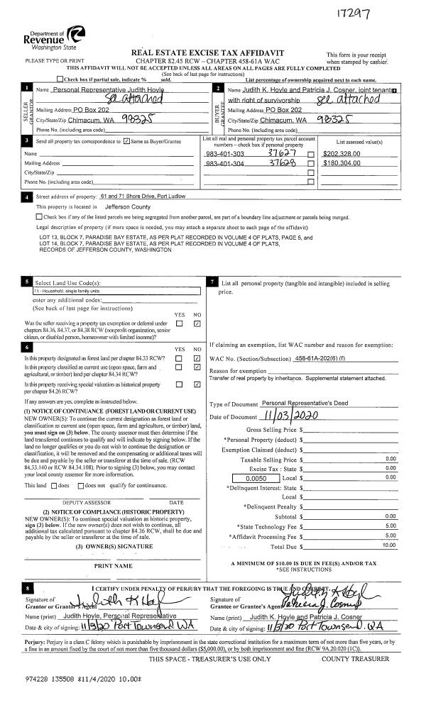 | Mailing Address: | 101 HIGHLAND GRNS UNIT 2 PORT LUDLOW, WA 98365-8201 | % Ownership: | 100.0000000000% |