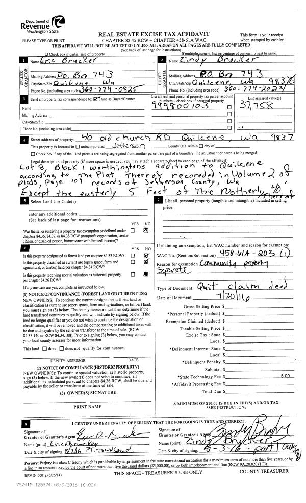 | 1 | 08/31/2015 | REC | Real Estate Contract | ROBERT W JACKSON | CHIMACUM HEIGHTS LLC | | | $160,000.00 | 123979 | |
