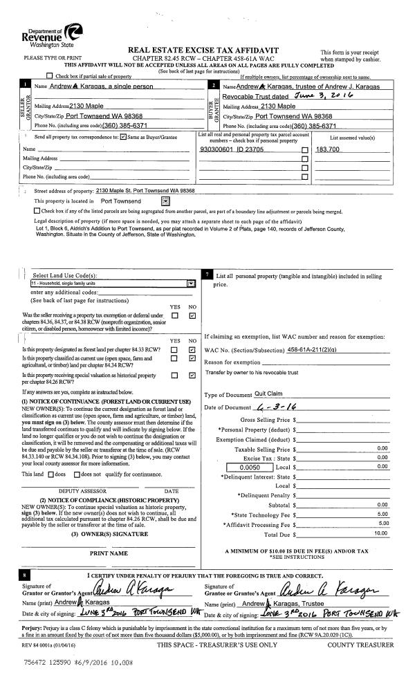 | Mailing Address: | MARGARET C STANLICK 1526 23RD ST PORT TOWNSEND, WA 98368 | % Ownership: | 100.0000000000% |