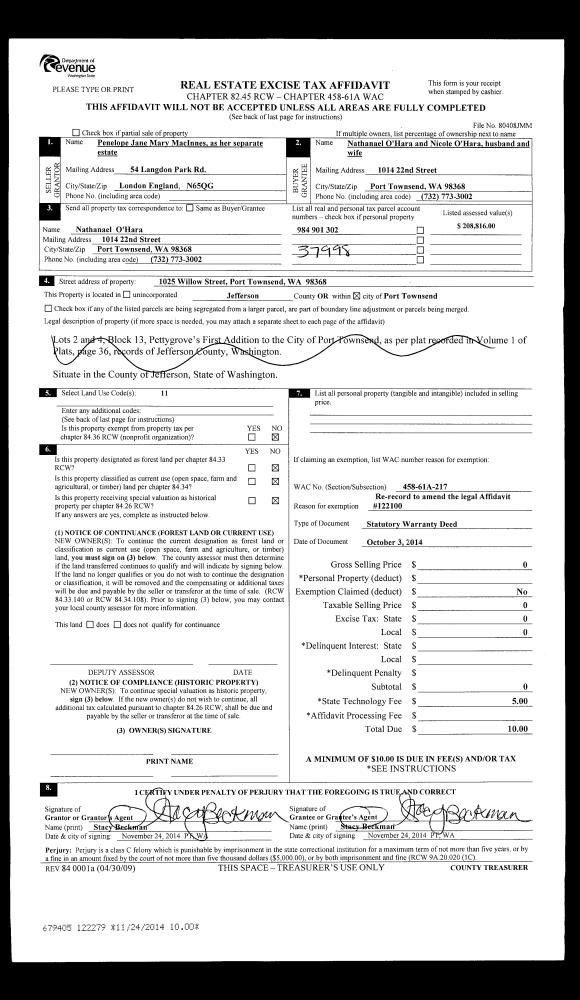 | Mailing Address: | 90 S CHANDLER COURT #B PORT LUDLOW, WA 98365-9541 | % Ownership: | 100.0000000000% |