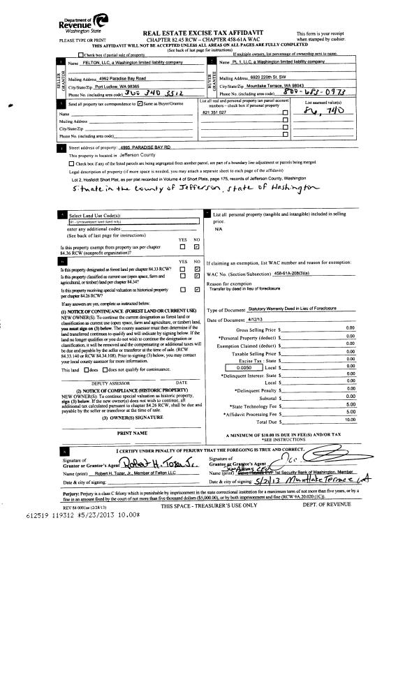 | 3 | 06/18/2013 | TRED | Trustee Deed | NORTHWEST TRUSTEE SERVICES INC | JPMORGAN CHASE BANK | | | | 119460 | |