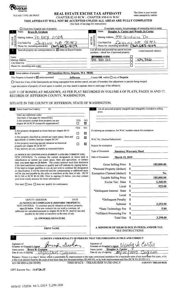 | 3 | 07/22/2019 | SWD | Statutory Warranty Deed | EARL T & CAROLE J LANE | ALFRED & MARILYN CASS | | | $499,000.00 | 132854 | |
