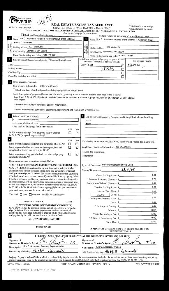 | 1 | 12/23/2015 | SWD | Statutory Warranty Deed | HENRY WERCH | RONALD & SARAH IRICK | | | $51,000.00 | 124599 | |