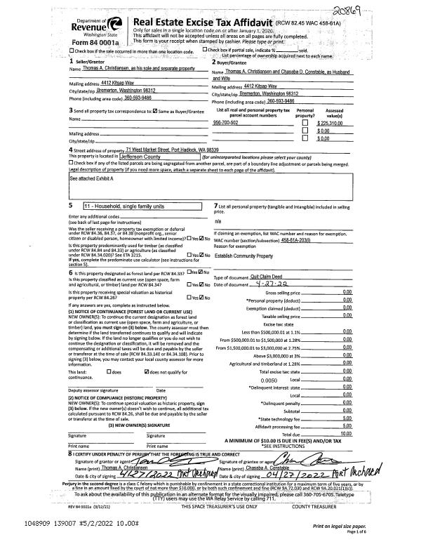 | Mailing Address: | 24 SWEET HOME RD PORT HADLOCK, WA 98393 | % Ownership: | 100.0000000000% |